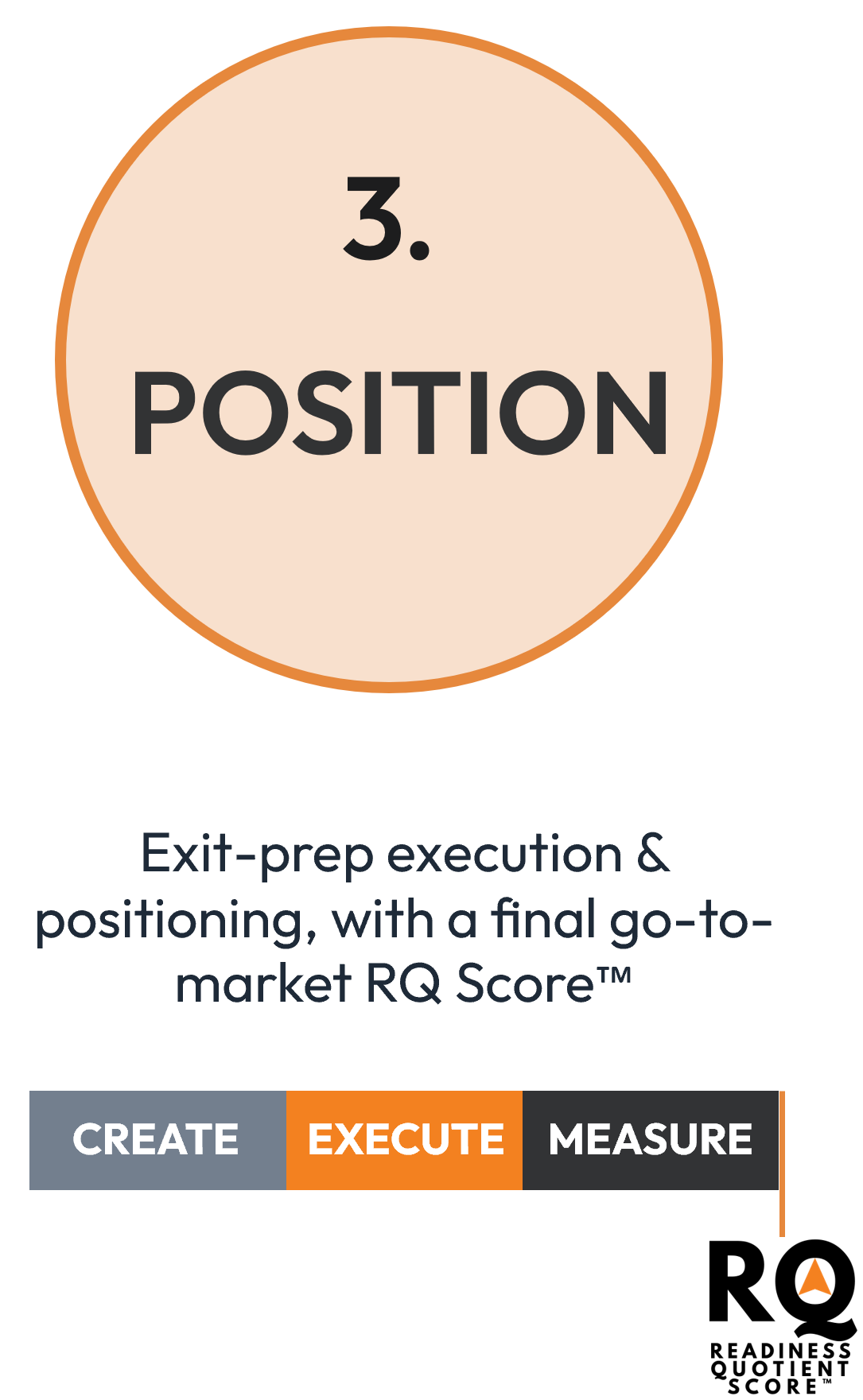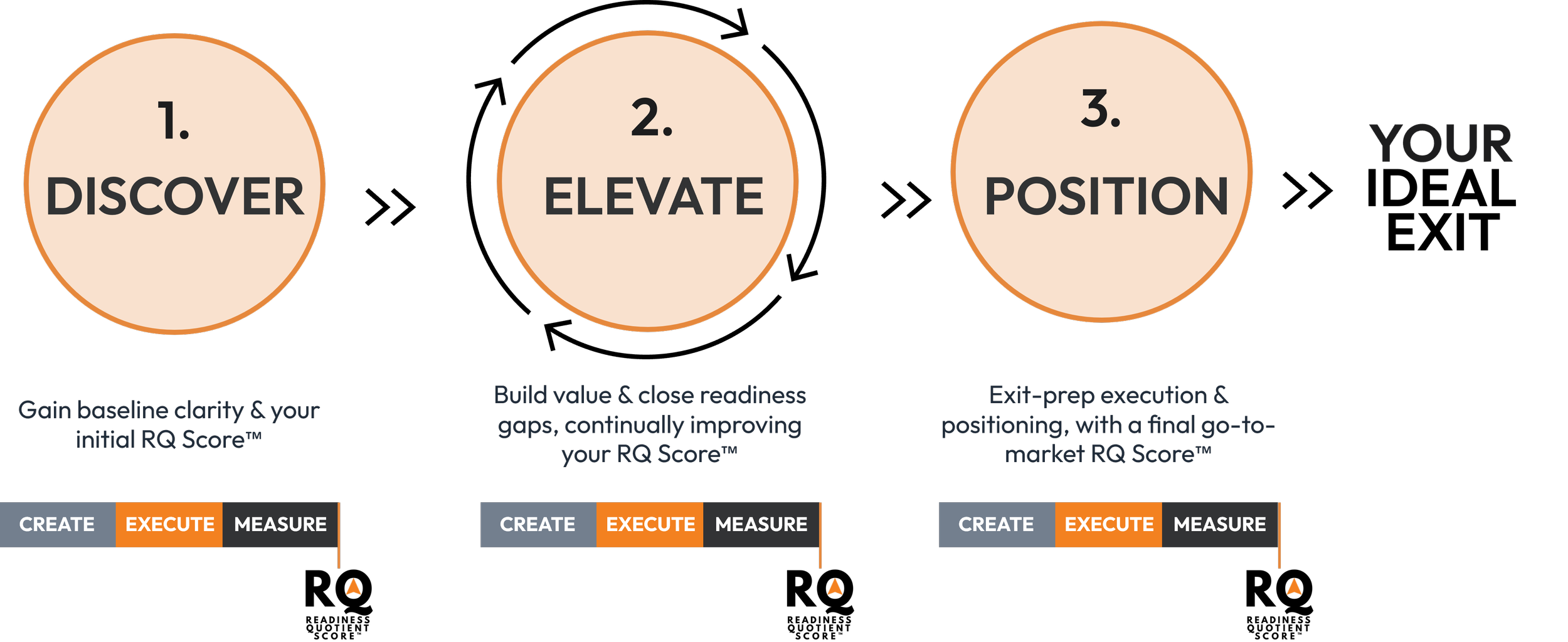 Similar to the Elevate phase, your advisor will meet with you on a regular basis in order to help put your plans into action. We’ll be working on things like prepping materials, cleaning up operations, and compiling KPIs and other important narrative materials. We’ll also act as a liaison for supplemental support you may need such as legal, tax, or bankers. During this phase we’ll also be doing our final re-calibration of your RQ Score™ & Comprehensive Report.